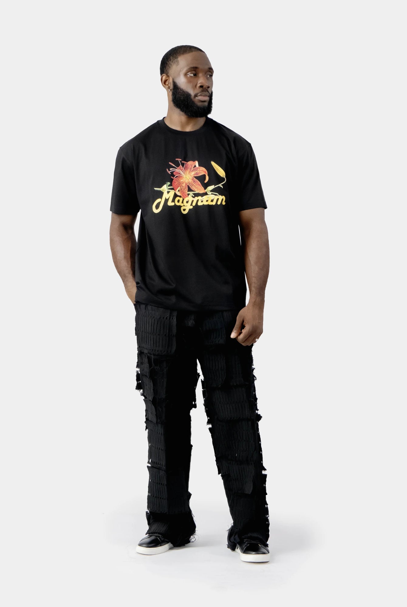 This t-shirt embodies the signature and elegance of Magnum style, featuring floral designs and "MAGNUM" text in a frontal view. With a crew neck and short sleeves, it has a regular fit for comfort and style.