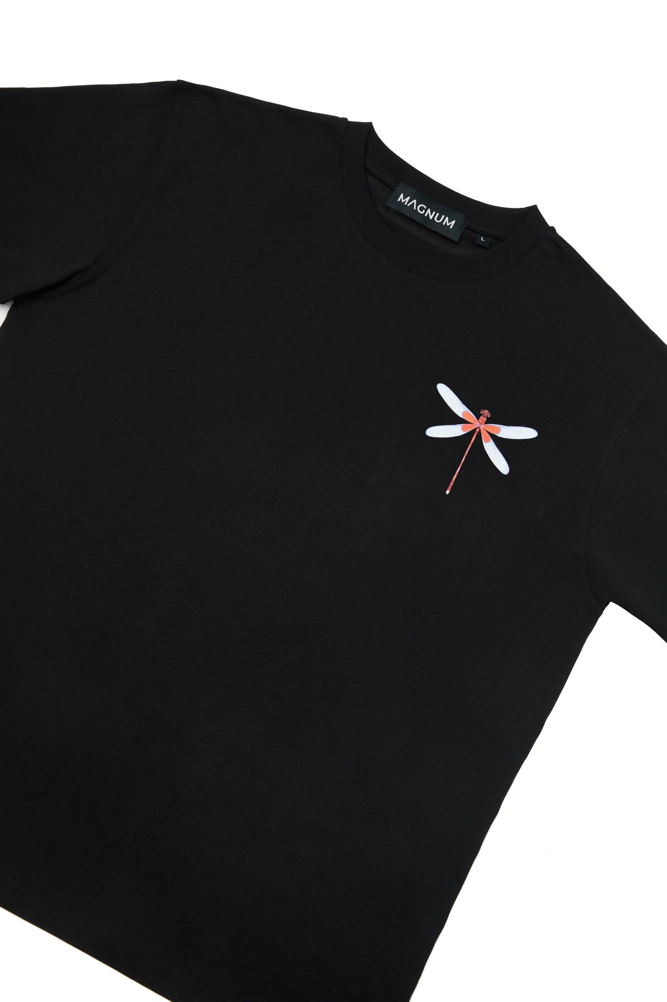 Introducing Magnum Draco - a statement piece that exudes the essence of majestic power, mythical allure, and timeless enchantment. This remarkable print showcases a dragonfly on the pocket of a crew neck t-shirt with short sleeves. Embrace the regular fit and feel confident, powerful, and stylish throughout the day.